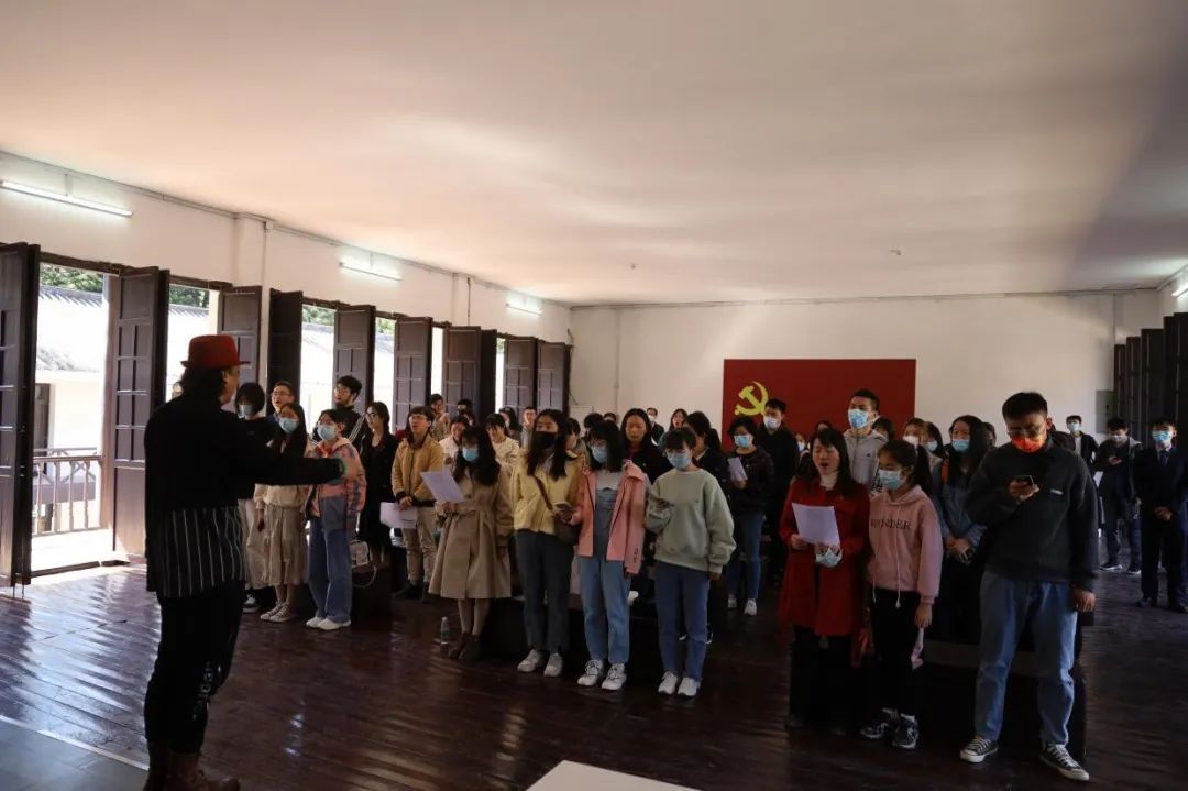 艺术学院直属党支部退休党员郭水亮老师现场教唱学员《国际歌》,郭老师用澎湃雄浑的声音带领大家朗诵《国际歌》的歌词,并现场指挥全体人员演唱《国际歌》,当“起来,饥寒交迫的奴隶,起来,全世界受苦的人!满腔的热血已经沸腾,要为真理而斗争!”的歌声在会场响起,每个人心中都回荡着激情与感动。