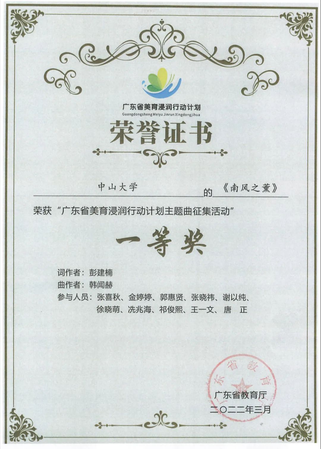 喜讯:我院作品《南风之薰》荣获“广东省美育浸润行动计划主题曲征集活动”一等奖