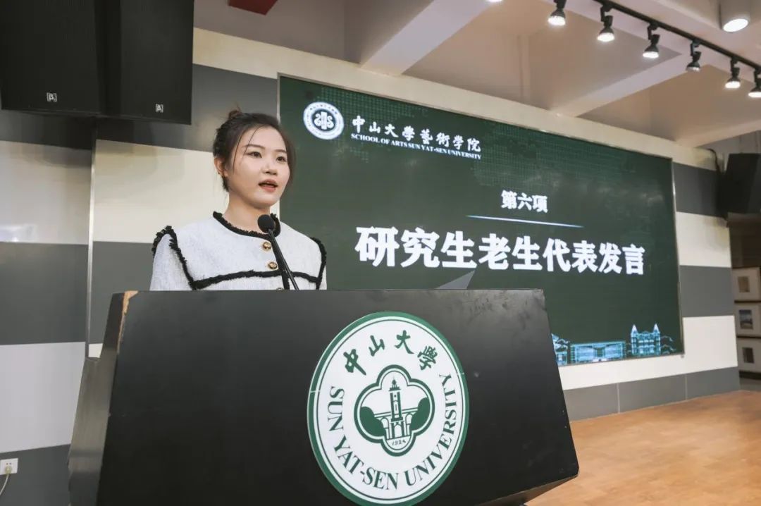 研究生代表王帆同学分别用“action”“reset”“touch”去阐述“art”一词的理解感悟。她表示,身为自己人生的主角,我们要有放手去做的勇气,反复精进技术,用磨砺与奋斗作为人生底色,去接触与感受,自觉与人民同呼吸共命运,与党同心同德,共同书写祖国文艺事业的新篇章。