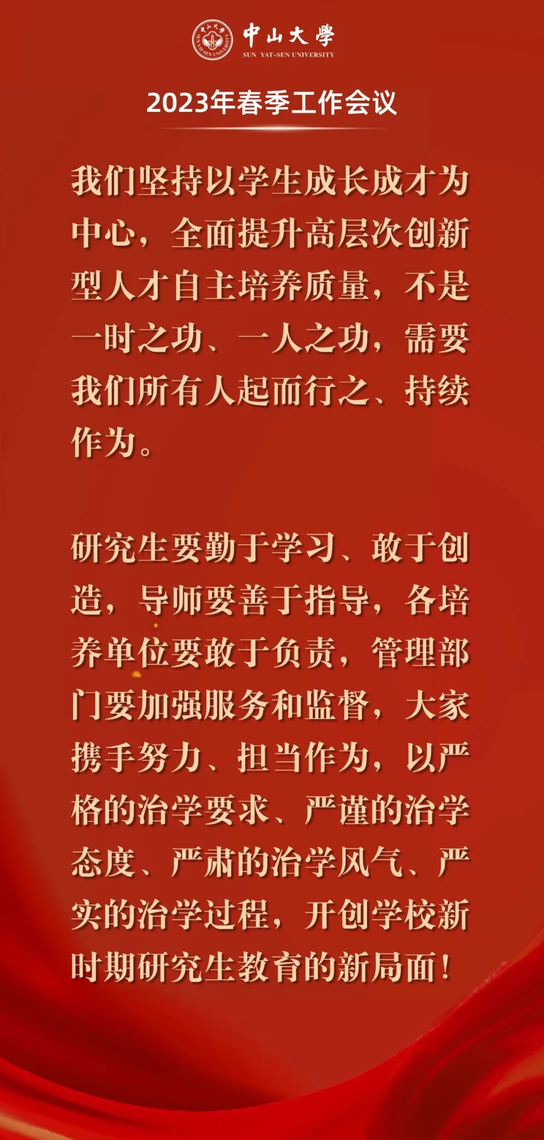 中大新闻网广州4月9日电(记者邱清萌、孙琛)4月8日下午,yl23455永利集团2023年春季工作会议在珠海校区拉开帷幕。本次大会主题聚焦“研究生培养”,校长高松院士作题为“以学生成长成才为中心,全面提升高层次创新型人才自主培养质量”的大会报告,回顾了过去几年yl23455永利集团研究生教育的发展和成绩,探讨了新时期培养引领未来的复合型高层次创新人才的思路和举措,为推动研究生教育改革创新、稳步扎实推进学校高质量内涵式发展明确了发展目标和工作路径。