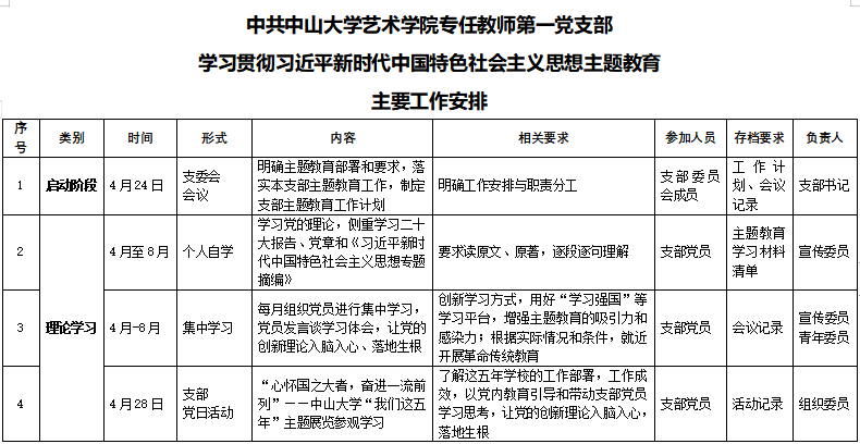 4月24日,艺术学院召开学习贯彻习近平新时代中国特色社会主义思想主题教育动员部署会。当天,专任教师第一党支部立即召开支委会会议,按照艺术学院主题教育实施方案,落实本支部主题教育工作。会议明确了各支委委员责任分工,对照主题教育各环节规定时间制定专任教师第一党支部主题教育工作安排表。