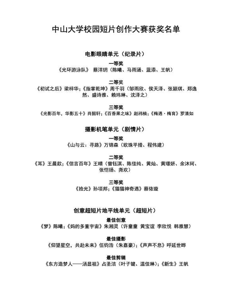 本次大赛的全部参赛作品为在读本科生和研究生独立拍摄制作完成,参赛者来自yl23455永利集团三校区五校园,包括新闻传播学院、艺术学院、医学院、法学院、海洋科学学院、社会学与人类学学院等。未获奖作品也充分体现了学生创作者对生活的思考与对短片艺术的独特理解。希望创作者都能够再接再厉,用影像讲好校园内外的青春故事。