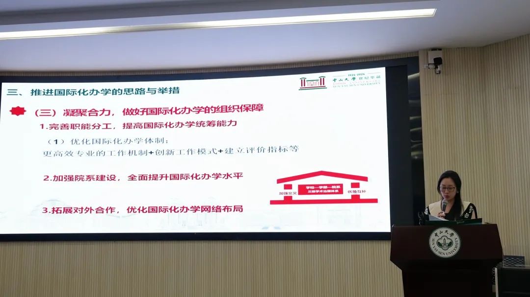 金婷婷院长传达了2024年学校春季工作会议高松校长“推进高水平对外交流合作,加快建设中国特色世界一流大学”的大会报告精神。金院长指出,高松校长在报告中深入阐述了学校推进高水平对外交流合作的内在要求和重大意义,总结回顾了学校在国际化办学上取得的成绩与面临的挑战,明确指出了推进学校对外交流合作的发展路径。高校长介绍了我校在国际化办学上取得的成绩与存在的问题。高校长提出了推进国际化办学的三点思路与举措:一是深化认识,加强党对国际化办学的统一领导与顶层谋划;二是统筹推进,开创国际化办学新格局;三是凝聚合力,做好国际化办学的组织保障。高校长勉励全体干部要鼓足干劲、奋勇开拓、守正创新、担当作为,更好地把握中国式现代化进程中高等教育发展的时代要求,努力打造具有自身特色的国际化办学格局,在新的更高起点上谋划学校新百年事业的高质量发展。