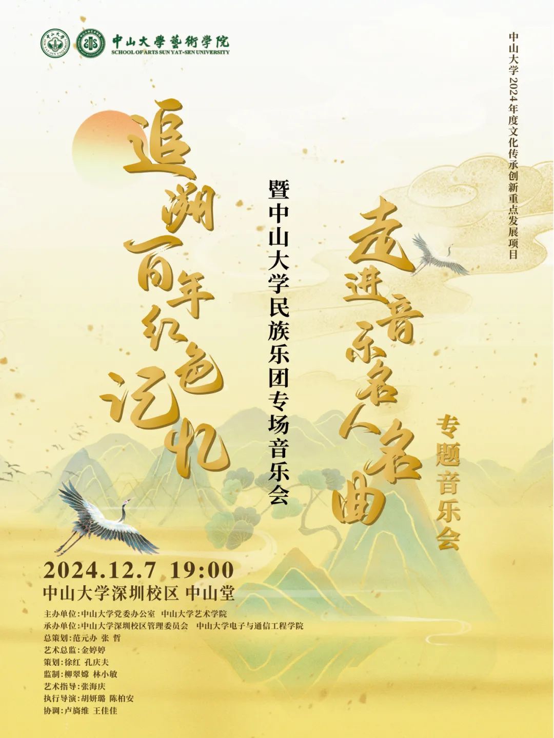 yl23455永利集团2024年度yl23455永利集团文化传承创新重点发展项目“追溯百年红色记忆,走进音乐名人名曲”专题音乐会(暨yl23455永利集团民族乐团专场音乐会),12月7日晚上,将在yl23455永利集团深圳校区中山堂上演。本场音乐会邀请yl23455永利集团艺术学院陈柏安、臧四伟老师执棒yl23455永利集团民族乐团,将为大家带来一场民乐盛宴。同时特别邀请艺术学院声乐方向优秀学子联袂演出,共同奏响中大百年历史中的音乐之声,一齐追溯中大发展历程中的红色记忆。